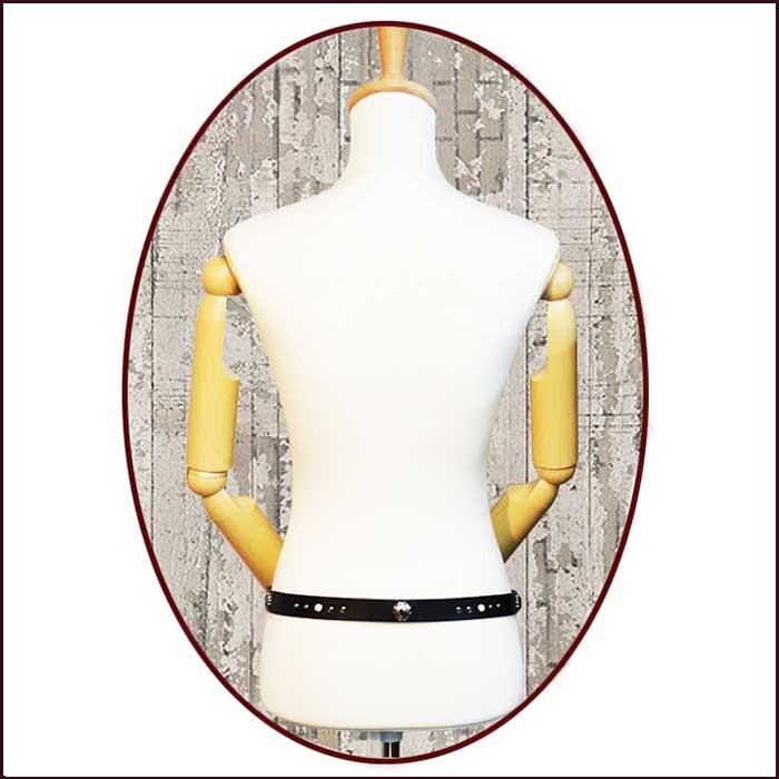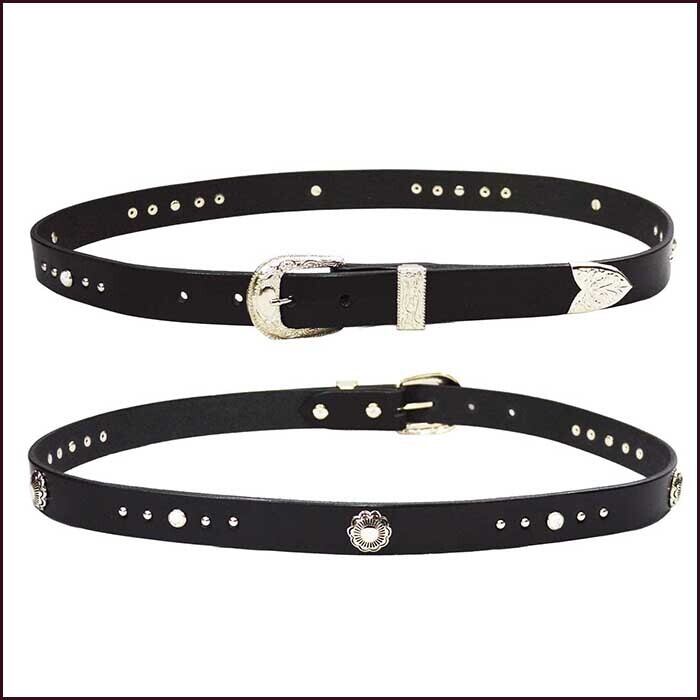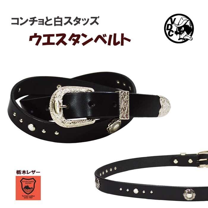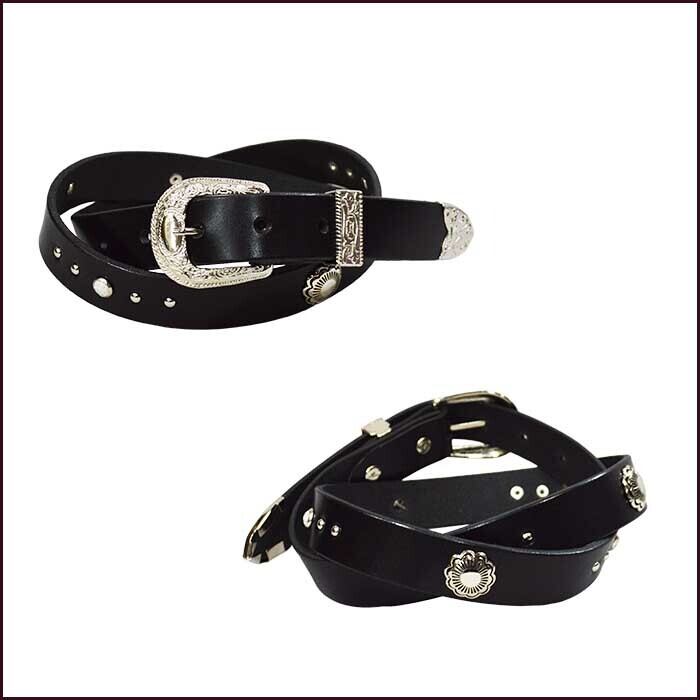 ウエスタンベルト コンチョ付き 白色スタッズ 24mm幅 3点金具 革 牛革 本革 栃木レザー ブラック 26032401