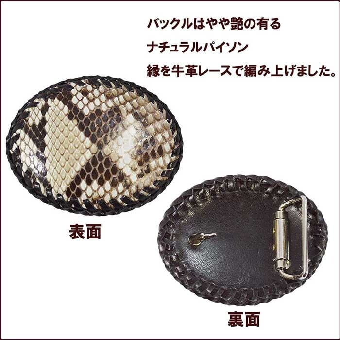 バックルは蛇革に牛革貼り合わせ、縁を牛革レースで編み上げました。
